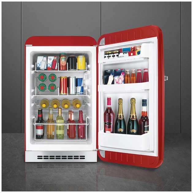 De Smeg FAB10HRRD5 vrijstaande koelkast heeft een netto inhoud van 135 liter. De koelkast is 97 cm hoog en heeft een breedte van 55 cm, met een diepte van 70 cm. Deze vrijstaande koelkast heeft energielabel E.