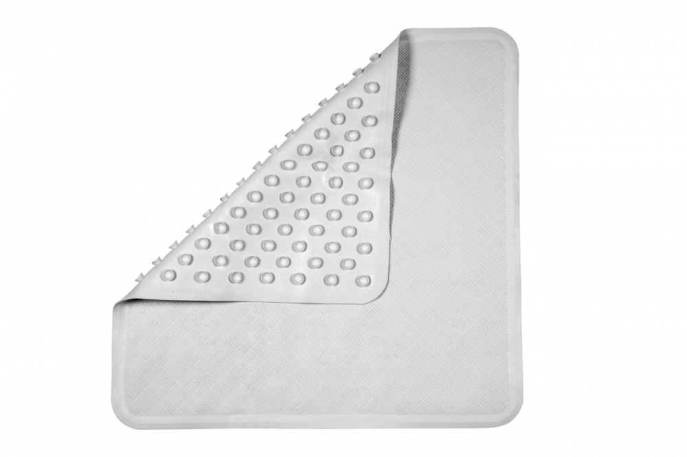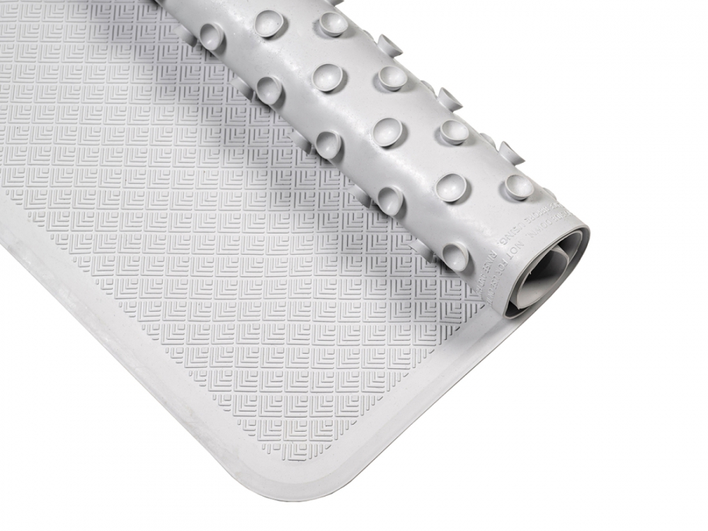 Deze rubberen douchemat heeft een geribbeld oppervlak voor meer grip. De zuignappen zorgen ervoor dat de mat niet wegglijd. Het water op de mat loopt vanzelf weg. Kan in de machine gewassen worden.